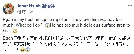 Egan先前才患了人生中的第一場感冒,還發燒至39.8度,讓Janet及老公擔心不已,現在又遭到蚊子的襲擊。今日Janet貼出一張Egan躺在床上吃手的照片,只見他白嫩的小肉腿上竟出現多處蚊子叮咬的痕跡,讓Janet無奈的說:「Egan是我們全家的最好的防蚊液,蚊子太愛他了...我們其他的人都被忘了。這麼辦啊?!他的肉肉太多太好吃了...每一個人(蚊)都想要咬一口!」網友們笑說「蚊子最愛蜜大腿」、「連我都想咬一口」,並建議Janet可以使用蚊帳或捕蚊燈來保護兒子免於攻擊。Janet時常分享育兒生活。(翻攝自Janet臉書)Egan的腿遭蚊子攻擊。(翻攝自Janet臉書)蚊子對兒子的愛讓Janet相當無奈。(翻攝自Janet臉書)