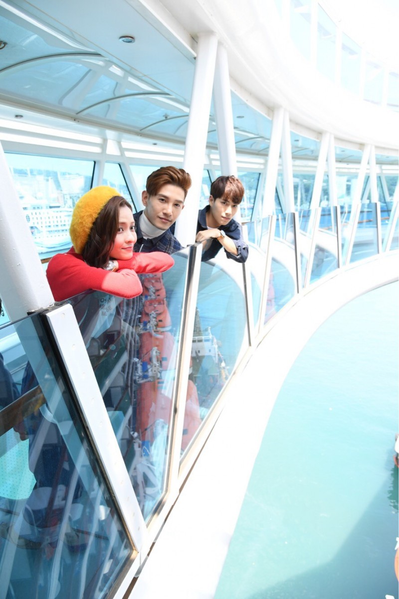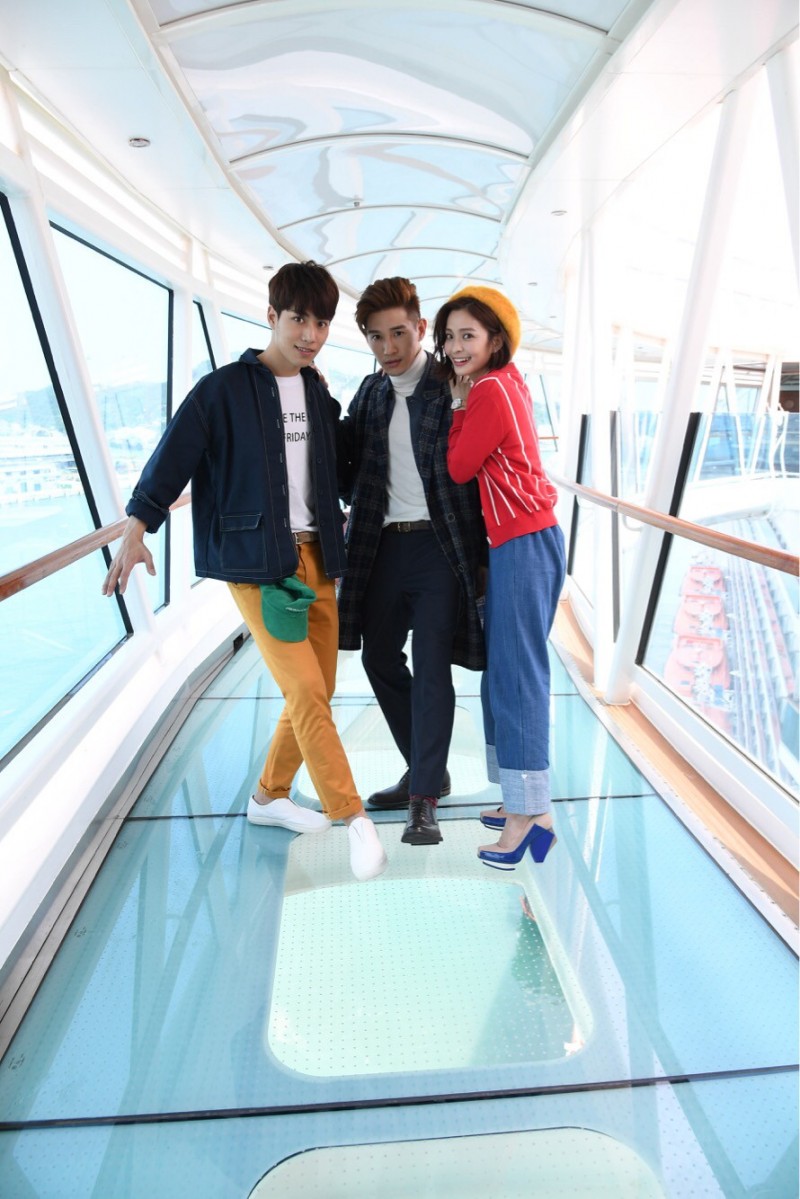 這次在郵輪上工作讓他們難忘的是玻璃空中步道,葉星辰說真正走上去時有點腿軟,透明的玻璃往下望就是大海,拍攝時來來回回走了四五次有,以為自己不怕了,但跟子閎一起在步道上往下看時,他幼稚的從背後推她一下,讓葉星辰嚇到尖叫。