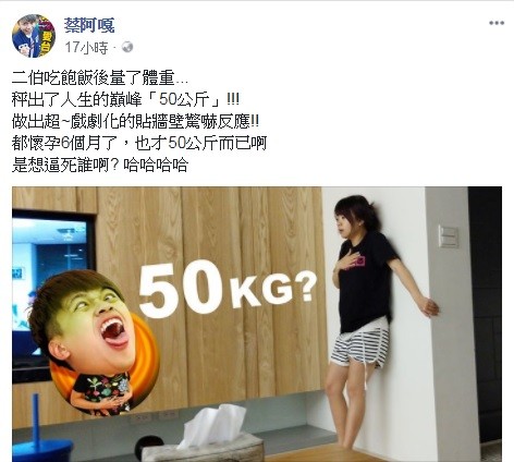 蔡阿嘎在臉書表示老婆在吃飽飯後量了體重,赫然發現體重機上的數字來到人生顛峰的「50公斤」,並PO出一張二伯用手撫胸靠在牆壁上的照片,一臉驚魂未定的表情相當戲劇化,讓蔡阿嘎不解的說「都懷孕6個月了,也才50公斤而已啊,是想逼死誰啊」,但二伯一直以來都十分纖瘦,看到5字頭難免驚訝,但從照片中可看到她除了肚子有些微凸,四肢仍十分纖瘦,網友們也直呼「沒懷孕都超過50」、「炫耀文來著」、「標準的媽媽懷孕胖爸爸」。