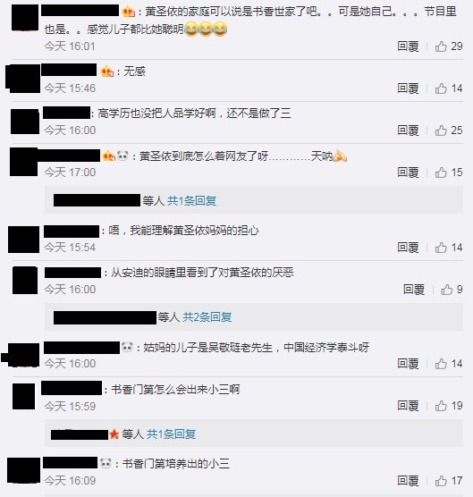 黃聖依表示媽媽過去在美國擔任記者,與東方世界相比思想較為開放,黃媽媽則說她的爸爸畢業於清華大學,嬸嬸與媽媽是上海音樂學院鋼琴系同學,姑姑為《新民晚報》的創始人,自豪的說「我們家就是一個新聞世家」,但網軍們對於這番言論不以為然,再度提起黃聖依當小三的舊事,大酸「書香世家的孩子怎麼會當小三」、「黃聖依的所作所為有點給這家人丟臉」、「家人有文化不代表她也有」。