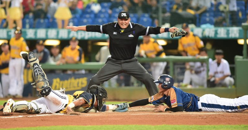 林承飛與王峻杰上演本壘攻防戰。(記者廖耀東攝)