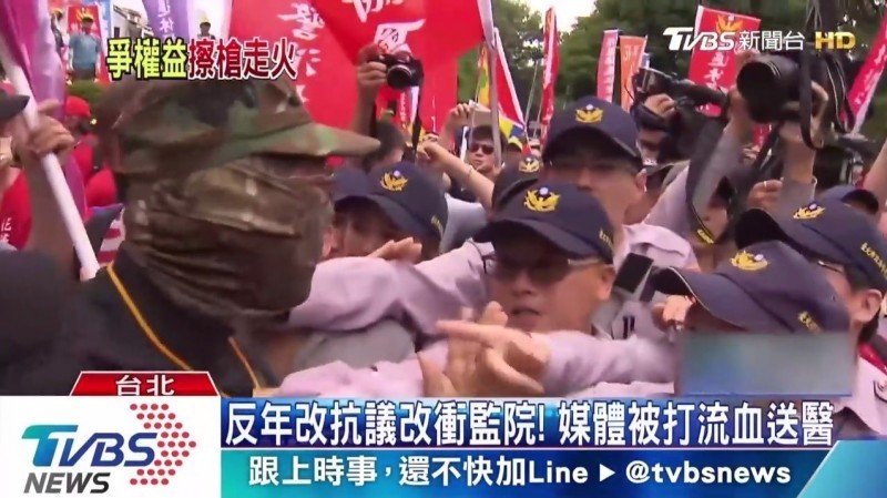 〔記者蕭宇涵/台北報導〕由退休警、消發起,反年金改革的「警消不服從」陳情遊行活動,本月23日爆發脫序毆打記者的衝突,現場多人戴口罩蒙面施暴,至少4名不同媒體記者分別被以板凳、旗幟等物搥擊頭部、腹部,造成流血、挫傷等,TVBS記者更檢查出顱內出血及輕微腦震盪。