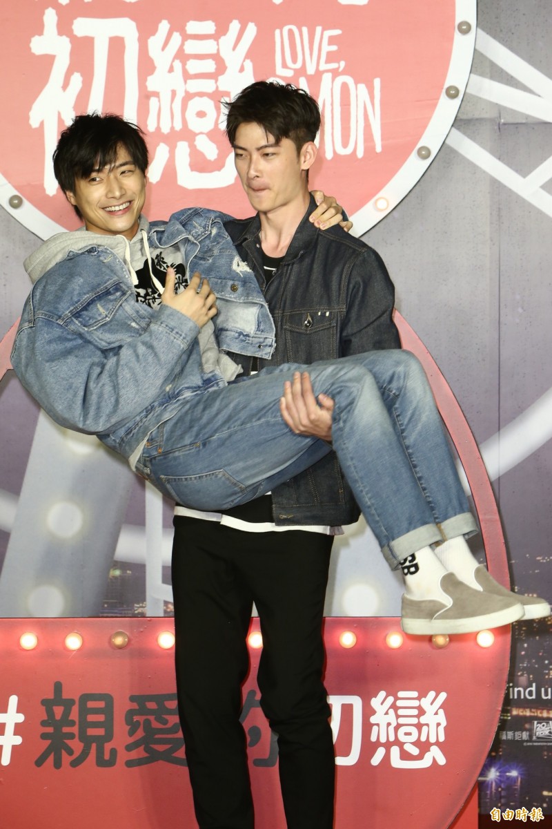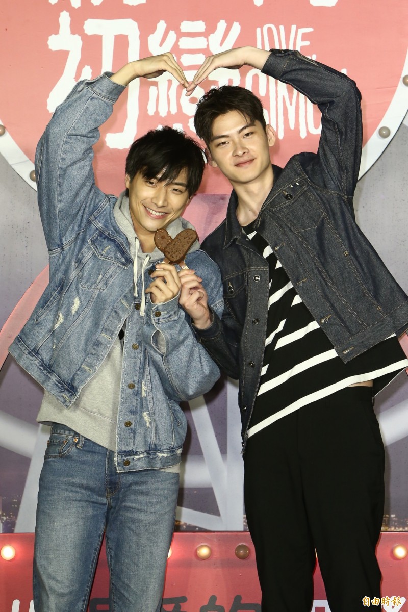 〔記者吳琬婷/台北報導〕同志電影《親愛的初戀》今晚舉行首映會,片商找來BL劇《深藍與月光》的「言海」CP陳彥名、王庭勻站台,兩人在活動中互向對方真情告白,讓粉絲尖叫聲連連。陳彥名更透露,兩人初次見面就要拍床戲,當時天氣熱,王庭勻的汗恰好滴進了他的眼睛,他原想自己用手擦掉,沒想到王庭勻竟輕壓著他的手,幫他把眼上汗水抹掉,讓他直呼:「那一瞬間還真有心動的感覺!」