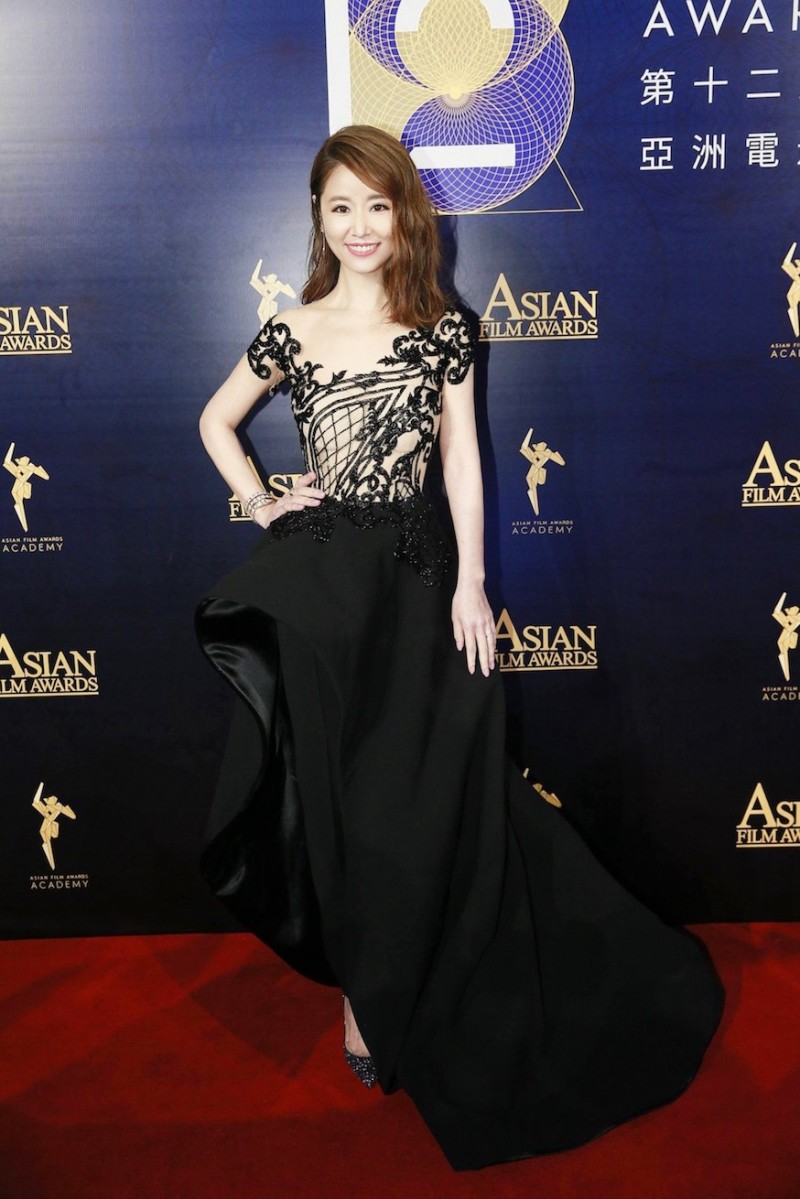 林心如穿著Christian Louboutin Iriza黑色亮片高跟鞋現身第12屆「亞洲電影大獎」。(Christian Louboutin提供)