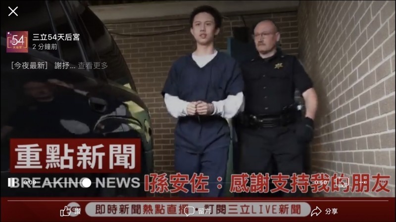 〔記者吳志偉/台北報導〕狄鶯、孫鵬18歲獨子孫安佐上月28日因涉嫌恐攻威脅遭捕,他在台灣時間25日晚間7點25分,現身賓州當地法院,頂著一顆平頭、藍色囚服,手上還被上手銬,當一看到台灣媒體包圍他時,卻精神異常亢奮,不但在囚車比YA,還吐出「超ㄎㄧㄤ」的金句,心理醫生分析,他會有這樣不合情理的回應,有二種特徵。