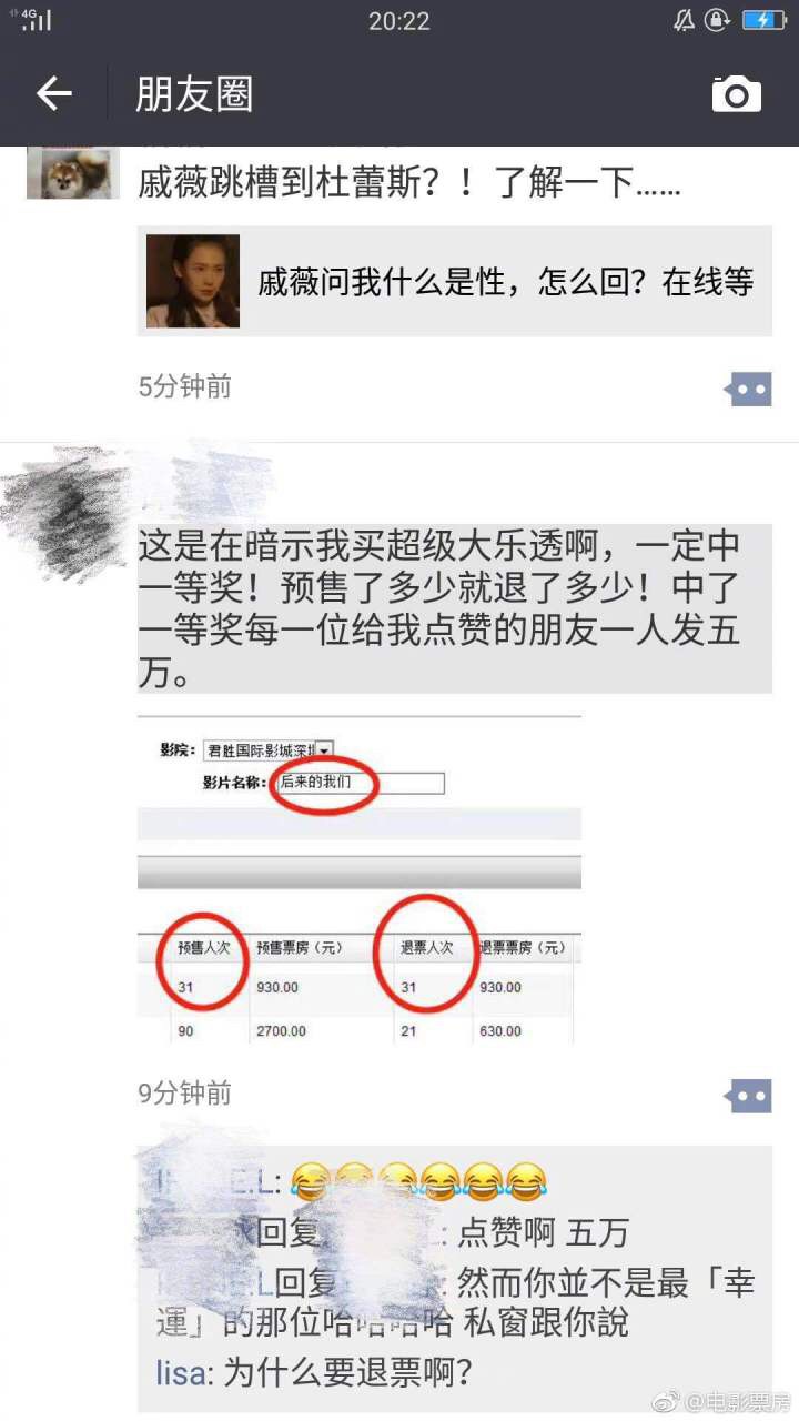 微博主「電影票房」貼出對話截圖,懷疑出品方「貓眼」利用電影院退票機制漏洞,上映前先行購入大量預售票,使《後來的我們》先衝上排行榜,等到電影上映後再退票。而截圖中某家電影院顯示之前有31人購買預售票,但上映後31張票卻全被退回,啟人疑竇。