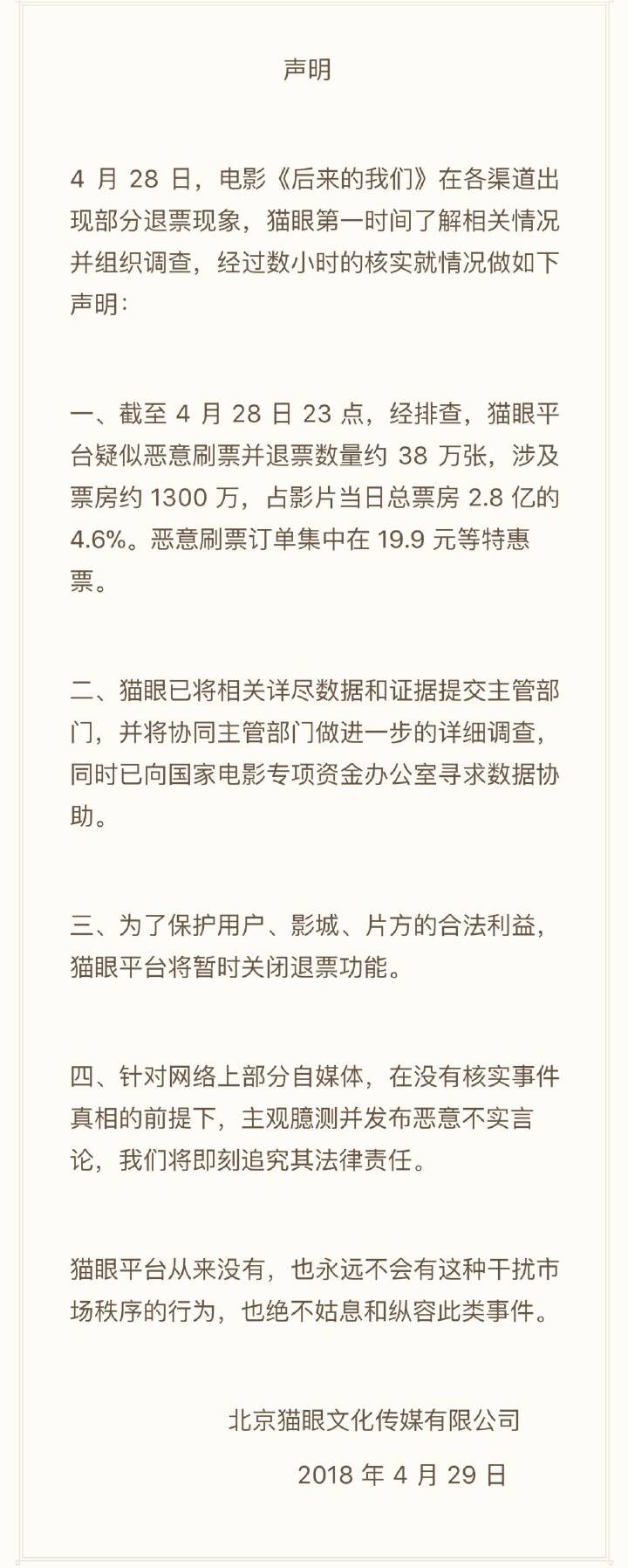 對此,貓眼電影深夜在微博發出聲明表示,退票總數達38萬張,金額達人民幣1300萬元(約新台幣6500萬元)大部分是優惠時段的電影票,懷疑是人為惡意搶票,已將證據提交給主管部門。該出品方強調:「貓眼平台從來沒有,也永遠不會有這種感擾市場秩序的行為,也絕不姑息和縱容此類事件。」