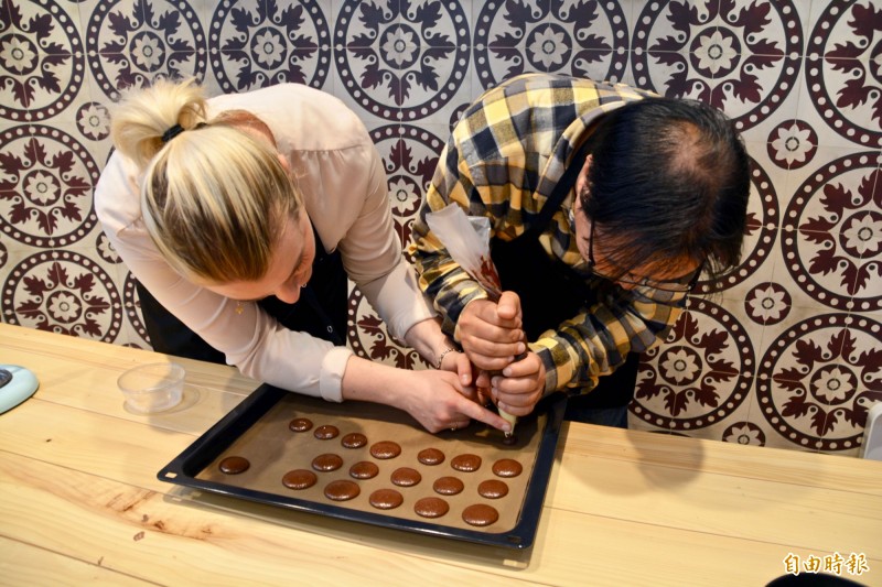 來到百貨公司內的體驗區,在烘培老師的指導下,首先學習製作馬卡龍的外層餅皮,將所有材料攪拌均勻後的麵糊裝在擠花袋中,在烤盤上擠壓出一個個圓形狀,而擠壓時盡量讓每個圓形的大小雷同,雖說做來不難,但有時不小心一時「失手」,擠壓出來的圓形大小有所差別,之後將擠壓好的圓形麵糊放入烤箱烘培。