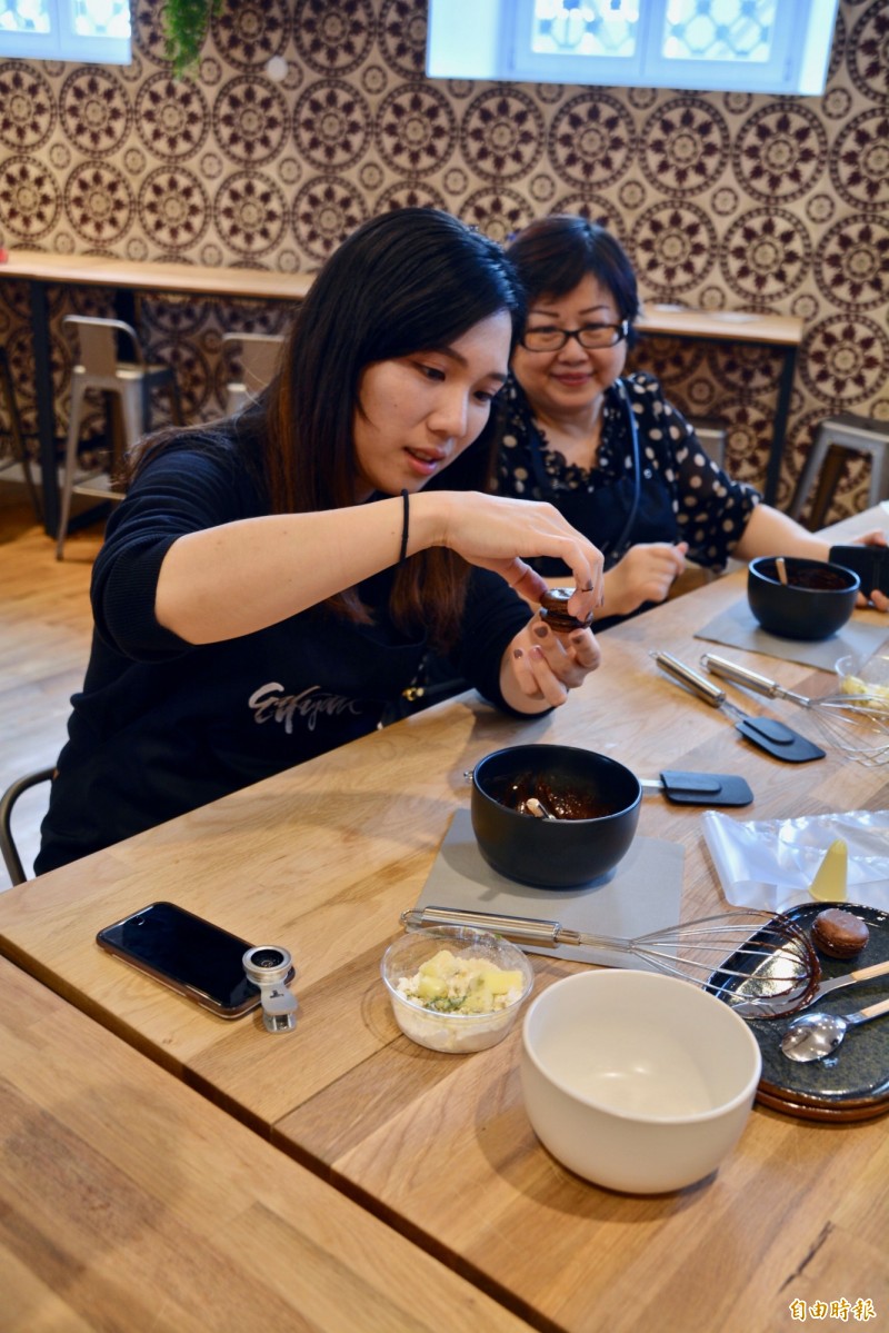 接下來是製作馬卡龍內餡,當天製作的是巧克力及開心果口味的內餡,依照老師的教學步驟將內陷製作完成後,將餡料抹在圓形餅皮上,再將另一圓形餅皮覆蓋其上微微輕壓,馬卡龍製作完成!品嘗自己DIY手作的馬卡龍,品味法式甜蜜滋味同時又體驗自己的手藝,滋味難忘!