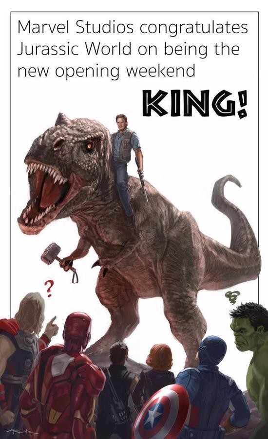 先前《侏羅紀世界》開片超越《復仇者聯盟》時,漫威總裁凱文費吉也在推特祝賀對手登上冠軍寶座,尤其《侏羅紀》男主角也是漫威自家的「星爵」克里斯普萊特,漫威也樂見他人氣更高。之後換《原力覺醒》超越《侏羅紀》票房,則有暴龍為機器人BB-8加冕,相當有趣。《復仇者聯盟:無限之戰》全台上映中。
