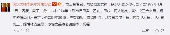林志玲今在微博上發出一張美照並寫下「有看到我嗎?」,貼文意外引來一位自稱是「風水大師李東水河南粉絲」的網友回應:「肯定有看到,萌萌噠的女神,多少人喜歡你和言?言1977年1月1日,丙辰、庚子、戊午,林1974年11月29日甲寅,乙亥,甲戌,兩人地支,寅午戌三合火局,明年感情尚且不穩定,但是明年2019,應有婚相,敬請期待,只是言是戊土命,林是甲木命,甲木剋戊土,婚後林占主導,恐怕言是疼老婆的命,祝福。」直接幫林志玲和言承旭算起命來,此留言馬上成為焦點,網友也紛紛敲碗回應:「希望言承旭和志玲姐姐早日公佈戀情」、「快結婚吧!」