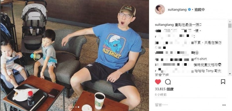 隋棠自從晉升為媽媽後,時常在Instagram上紀錄育兒點滴,老公Tony的照片相對較少。今她po出4張照片寫下:「重點在最後一張」,照片中兒子Max、女兒Lucy和老公Tony似乎是在享受下午茶時光,只見疲累的Tony大喇喇的打著哈欠,和身上穿的《藍色小精靈》T-shirt表情不謀而合。貼文引來網友留言:「爸爸累了」,也有網友紛紛吐槽隋棠:「人妻的逆襲!」、「爸爸被出賣!」