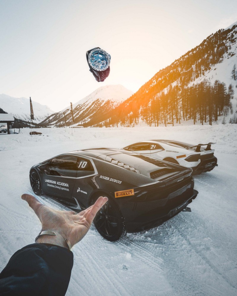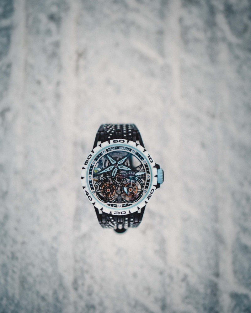 羅杰杜彼這款雙飛行陀飛輪腕錶以白色陶瓷錶圈搭配藍色標記,襯托由鈦金屬和藍寶石水晶玻璃組成的錶殼,也為RD105SQ手動上鏈機芯注入非凡的視覺效果。此機芯錶盤裝飾著藍色的「Astral Skeleton星辰鏤空」經典造型元素,搭載著效仿賽車座艙燃料計的多色彩動力儲存顯示器,標誌性雙陀飛輪分別設於錶盤5點鐘和7點鐘位置,週邊環圈上設置的計秒器神似汽車測速錶,搭配著具有汽車風格的指針;具有不對稱設計的圖紋錶帶鑲嵌數十個鈦金屬飾釘,效仿冰天凍地條件中利於抓地的雪釘輪胎的設計。