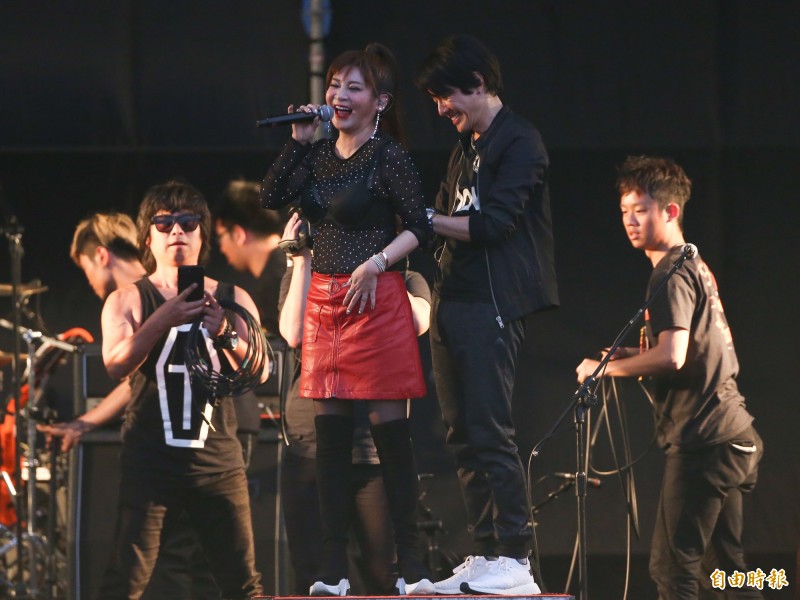 〔記者羅子欣/高雄報導〕「台灣濱崎步」王彩樺與四分衛樂團合體登「2018大港開唱」,新鮮組合令歌迷期待度爆表;她今以紅色皮裙加黑色薄紗火辣現身,薄紗裡的黑色金邊Bra一覽無遺,熱力嗨唱招牌歌曲《保庇》與《小姐請你給我愛》、《愛情限時批》,引爆台下口哨、尖叫聲不斷。