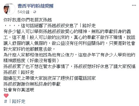 曹西平在臉書悲痛表示「你好我是你們老朋友孫越」這句話已成絕響,他對孫越將自身奉獻於公益的精神佩服不已,認為這種愛心不是一般人可以辦到的,大讚他真心奉獻,既不做作也不矯情,只要是對社會好的事他都會去做,而現在孫叔叔累了想好好休息,希望大家能祝福他一路好走,更用孫越的另外一句金句感性的說:「繼續在天上帶領大家說『夜深了趕快打個電話回家』,孫叔叔謝謝你無私終身的奉獻,社會有你真溫暖。」