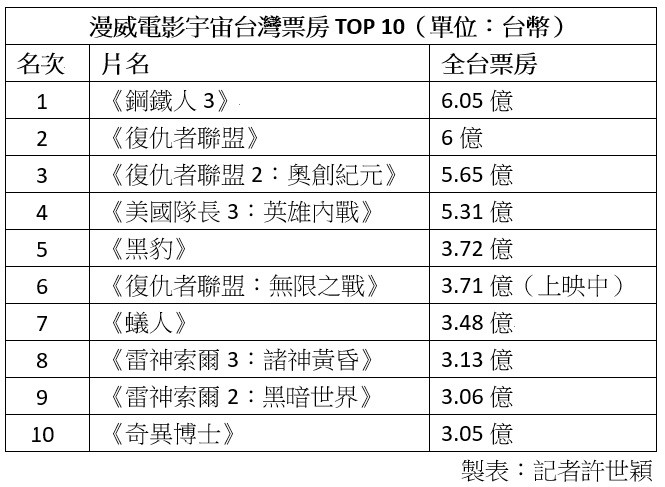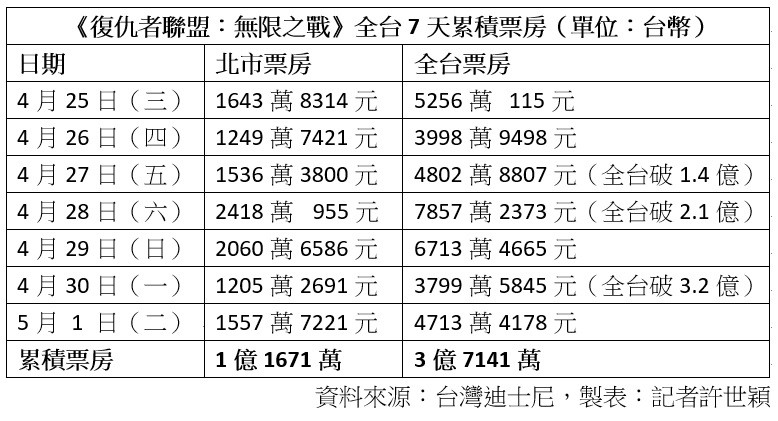 〔記者許世穎/台北報導〕漫威電影宇宙10周年最強力作《復仇者聯盟:無限之戰》(《復仇者3》)在台票房持續飆升,從上映首日創下漫威在台最高開片紀錄後,穩坐票房冠軍寶座,截至昨天上映7天,全台累計票房高達3億7147萬。今天(2日)不僅將衝破4億關卡,更將超越年初漫威自家的《黑豹》,成為目前年度票房冠軍。