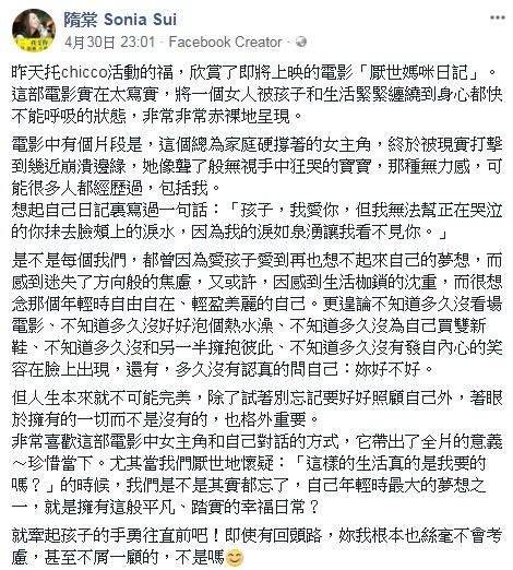 〔娛樂頻道/綜合報導〕電影《厭世媽咪日記》由莎莉賽隆主演,描述一位全心照顧孩子的母親在生活中遇到的大小難題,引起許多媽媽共鳴,而育有一子一女的隋棠看完後也心有戚戚焉,更公開了一段她在日記中所寫的崩潰文字。