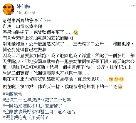 陳仙梅表示四月底時因要參加路跑,她每天練跑六公里並搭配TABATA運動,堅持一個月後卻只瘦了快1公斤,今年42歲的她無奈的說:「這年紀加上生過二個寶寶,代謝這麼差也不能怪什麼...。」近來她嘗試實行「生酮飲食」,透露她日前一口氣吃了半罐堅果及油膩膩的五花鹹豬肉,本以為體重又要飆高,沒想到一量發現3天減了2公斤,連體脂也跟著掉,讓她興奮表示「現在可以正大光明吃乳酪起司當零食,真是天堂啊。」