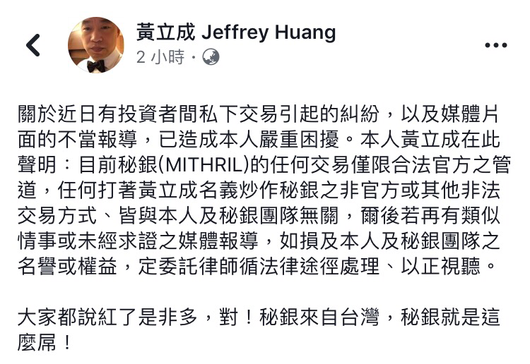 關於近日有投資者間私下交易引起的糾紛,以及媒體片面的不當報導,已造成本人嚴重困擾。本人黃立成在此聲明:目前秘銀(MITHRIL)的任何交易僅限合法官方之管道,任何打著黃立成名義炒作秘銀之非官方或其他非法交易方式、皆與本人及秘銀團隊無關,爾後若再有類似情事或未經求證之媒體報導,如損及本人及秘銀團隊之名譽或權益,定委託律師循法律途徑處理、以正視聽。