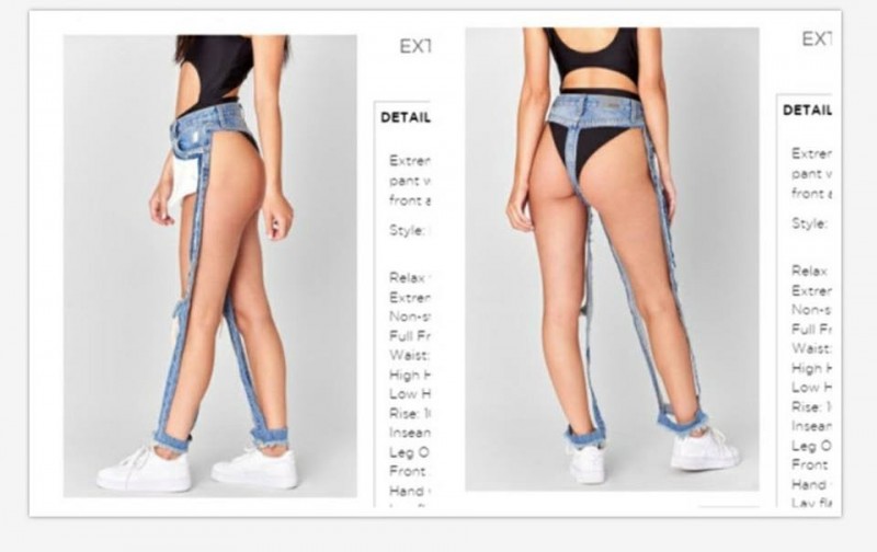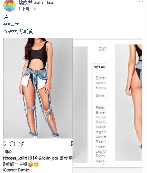 在粉絲貼出的照片中,只見模特兒穿了一件黑色開高衩泳裝,並挖了一個洞,露出肚臍與平坦小腹,泳衣外則搭了一件牛仔褲,但這件褲子中間僅膝蓋的地方有一些布料,其他地方都鏤空,整雙腿表露無遺,最狂的是當模特兒轉過身,背後同樣沒布料,只有像丁字褲的設計,整顆屁股蛋完全彈出,風格相當大膽,該名粉絲特地標注蔡依林「這件需要瞭解一下嗎」,沒想到蔡依林竟頗有興趣,表示「好!明白了」,更稱之為「辣味機場時尚」,網友看了直呼「不如不要穿」、「新專輯封面造型,就決定是這件了」,更有人笑說「這是情趣內衣吧」,釣出蔡依林回應「不好說」。