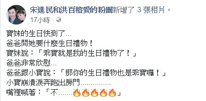 洪百榕在臉書透露宋達民問寶妹喜歡什麼生日禮物,沒想到寶妹竟窩心的說:「乖寶就是我的生日禮物了!」,貼心話語讓宋達民感到相當欣慰,他便對在一旁的小寶說「那你的生日禮物也是乖寶囉」,躺著也中槍的小寶一聽到立刻崩潰淚奔出房間,嘴裡還喊著「No」,兄妹倆兩極化的反應逗樂粉絲,笑說「小寶也太有戲」、「小寶當初不是想要弟弟嗎」,洪百榕也PO出寶妹抱著弟弟架式十足的照片,讓網友大讚「寶妹真是個好姐姐」、「姐姐好愛乖寶」、「姐弟倆好像喔」。