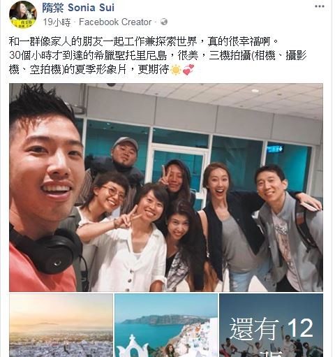 隋棠昨(6日)在臉書上分享一組照片並寫下:「和一群像家人的朋友一起工作兼探索世界,真的很幸福啊。30個小時才到達的希臘聖托里尼島,很美。」隋棠在文中透露此次遠赴希臘,就是為了拍攝她經營的服飾品牌新一季的形象影片,期間動用了相機、攝影機和空拍機,可見她對於自家品牌的用心。