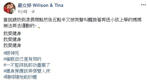 嚴立婷在臉書得意表示「誰說餵奶到凌晨兩點,然後五點半又被哭聲叫醒,接著再送小孩上學的媽媽無法再去運動的」,只見她身穿白色上衣搭配黑色運動褲,無論是站著或坐著都可以看到她的鉛筆腿極細,完全看不出已是兩個孩子的媽,雖然疲累但她仍催眠自己「我愛健身」,並說「一不堅持就前功盡棄了」,更搞笑建議健身房該準備雙人床,如此一來就能隨時隨地秒睡,粉絲們直呼「瘦不是沒有原因的」、「生完還是這麼瘦」、「腿也太犯規了吧」。