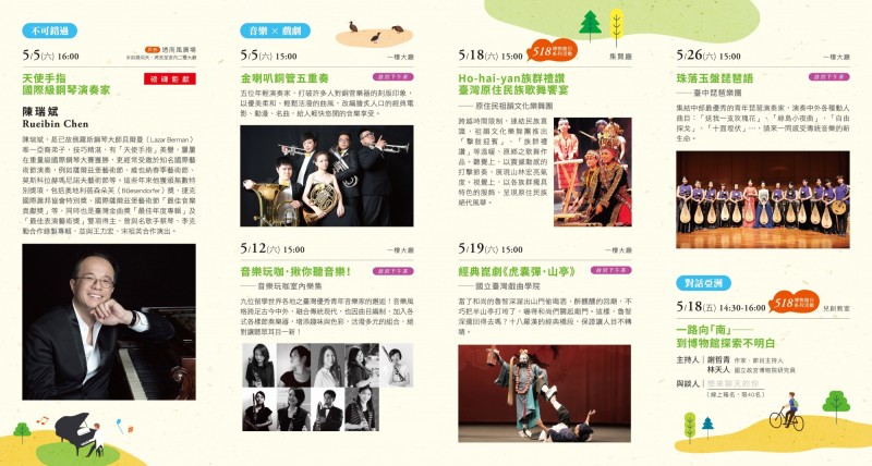 〔記者凌美雪/台北報導〕迎接518國際博物館日,故宮南院5月有3個周末免門票參觀,上週請來樂團與鋼琴家陳瑞斌演奏。接下來的2週,一樣有精彩的樂舞表演與親子體驗活動將登場。