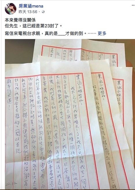 對於這封求親信,房業涵大翻白眼,她忍不住在臉書寫說:本來覺得沒關係,但先生,這已經是第23封了!更呼籲「不要再為難郵差先生了好嗎?」