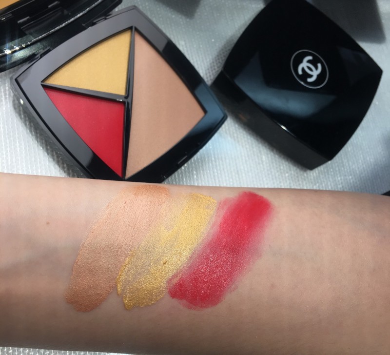 在營造夏日光澤感肌膚的部分,香奈兒推出「時尚玩色顏彩盤」新色#190 燦夏,有著little black palette (小黑彩盤)的稱號「時尚玩色顏彩盤」是一款結合三色、可作為打亮、修容、唇頰等多功能的隨身粉盒,這次推出的色系組合是以焦糖米色與燦亮金色修容霜,搭配覆盆莓紅腮紅,透過薄透色彩堆疊,創造略帶金銅色澤的肌膚。