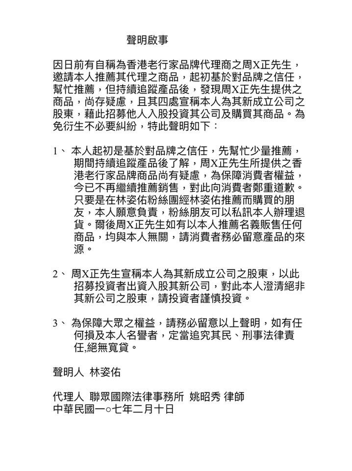 〔記者鍾智凱/台北報導〕小亮哥與老婆林姿佑捲入香港老行家糾紛,對方是自稱代理商的周男,一家人及林的弟弟遭指詐欺、妨礙名譽,林姿佑今反擊:「本人與香港老行家求證結果,香港老行家公司回覆表示周先生並非該公司雇員,更沒有委託任何人或公司在台灣代理或銷售商品。」