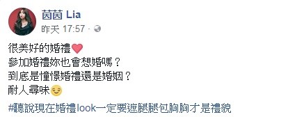 茵茵在臉書表示「很美好的婚禮,參加婚禮妳也會想婚嗎?到底是憧憬婚禮還是婚姻?耐人尋味」,文字中透露對婚姻的矛盾想法,從她秀出的照片中可以看到她身穿淡粉色薄紗長裙,腰間繫上腰帶展現小蠻腰,薄紗下的修長美腿若隱若現,穿著看似保守但又處處小露性感,更不會搶了新娘的風采,茵茵也透露「聽說現在的婚禮look一定要遮腿腿包胸胸才是禮貌」,而她也謹記這兩點,讓網友大讚「妳遮腿包胸都如此美了,露了還得了」。