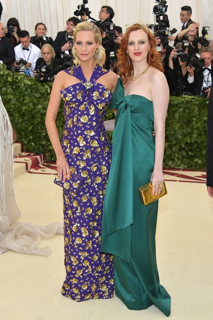 女星Tracee Ellis Ross身著訂製款粉紅刺繡禮服,搭配粉紅色緞面披肩;Issa Rae身著訂製款黑金色花卉刺繡錦緞亮片薄紗禮服,搭配黑金色花卉手拿包。名媛Poppy Delevingne身著訂製款紫羅蘭色和金色花卉繡花雙縐紗裙禮服,搭配緞面手拿包。
