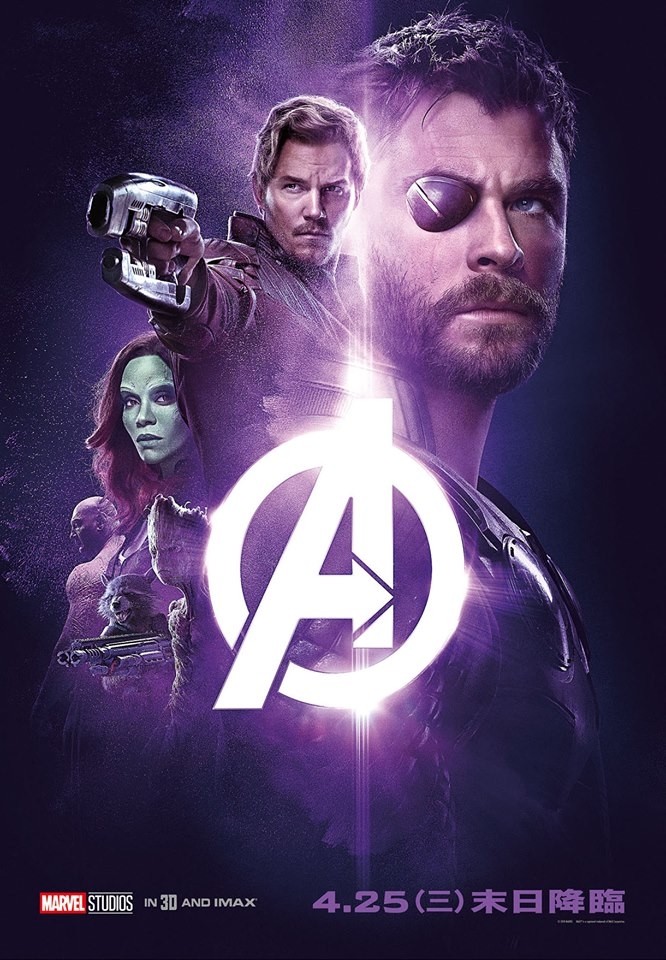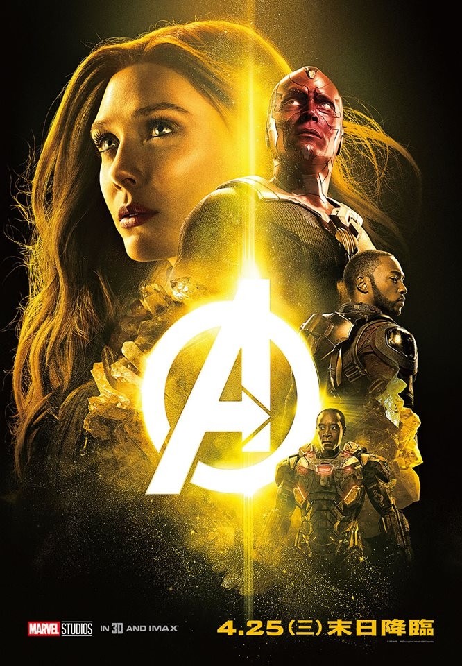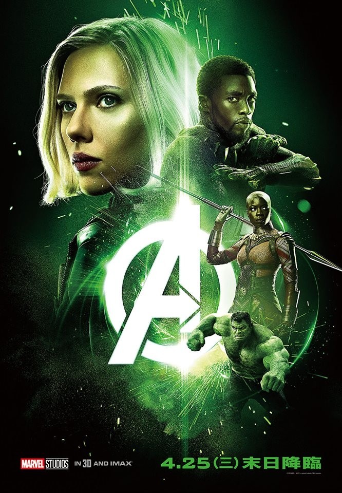 5款海報色系正好對應「無限寶石」的5種色系,包括對應「現實寶石」的紅色,海報上是鋼鐵人、蜘蛛人還有奇異博士和他的搭檔「王」的組合;「力量寶石」的紫色是雷神索爾加上星爵等「星際異攻隊」成員的外星組合;「心靈寶石」的黃色是緋紅女巫、幻視、獵鷹及戰爭機器;「時間寶石」的綠色是黑寡婦、浩克、黑豹及他的侍衛長奧科耶;「空間寶石」的藍色則是美國隊長、酷寒戰士、黑豹妹妹「舒莉」、以及涅布拉和螳螂女。