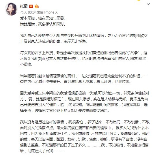 2015年時有人挖出張檬的男友與劉雨欣已結婚6年,並育有一子,當時張檬強調他們已離婚,自己不是第三者,近來張檬因整形引發話題,這段醜聞也再次被翻出,今日張檬在微博表示「愛本無錯,錯在無知與無畏。錯就是錯,我會承認和面對。我為自己為愛的年少無知與年少輕狂感到無比的懊惱,更為無心曾經對劉雨欣女士及其家人造成過的傷害,表示無比懺悔」,坦承當時自己太幼稚無知,更因此每天以淚洗面、酗酒及焦慮,最後又再次向劉雨欣鄭重道歉,此文一出掀起討論,張檬雖句句懇切,但許多人仍不認同,酸「這是承認當小三了?之前不是不承認嗎」、「別說對不起,好像不原諒你還是她的錯一樣」。