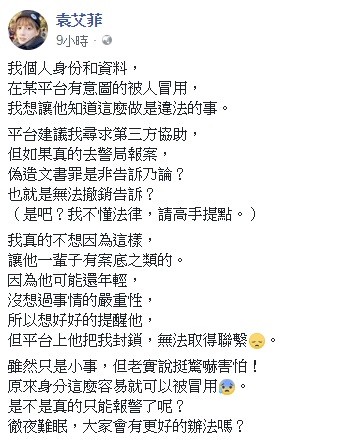 袁艾菲表示她的個人身份和資料在某平台被冒用,她希望讓對方知道這是違法行為,卻因遭封鎖無法與盜用者取得聯繫,但她卻不想因這件事讓對方留有案底,無奈的說:「因為他可能還年輕,沒想過事情的嚴重性,所以想好好的提醒他。」她因此徹夜難眠,並向網友詢問是否只有報警一途,有人提醒她「不要放縱對方而讓自己陷入困境」,更有網友說若不報警就是姑息養奸,只會讓他再去尋找下個目標,意外引起熱烈討論。