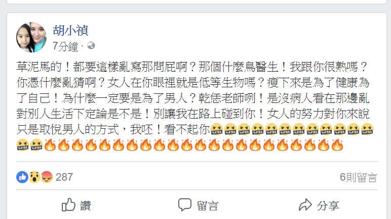 對此小禎在臉書崩潰以三字經怒罵,「草泥馬的!那個什麼鳥醫生!我跟你很熟嗎?你憑什麼亂猜啊?女人在你眼裡就是低等生物嗎?瘦下來是為了健康為了自己!為什麼一定要是為了男人?乾恁老師咧!」不爽被說為了李進良而瘦。