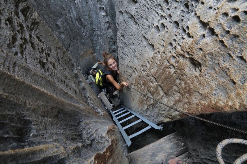 只不過其他的工作人員可是「挫咧等」,慘喊看起來就像超過40樓高的「刀山」啊!面對未知的高聳石林,沿路吊橋不僅深不見底,陽春型的吊橋還斷了幾片木板,要嚮導面對面牽著手才能過。