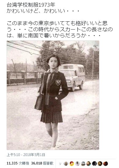 有日本網友在推特上傳一張1973年時所拍攝的照片,主角是位台灣女學生,只見她留著清湯掛麵的標準學生頭,領口綁著領帶穿上制服大衣,並搭配百褶裙,秀出纖細美腿,雖然沒有露出笑容,但清秀五官加上清純氣質絕對是校花級人物。