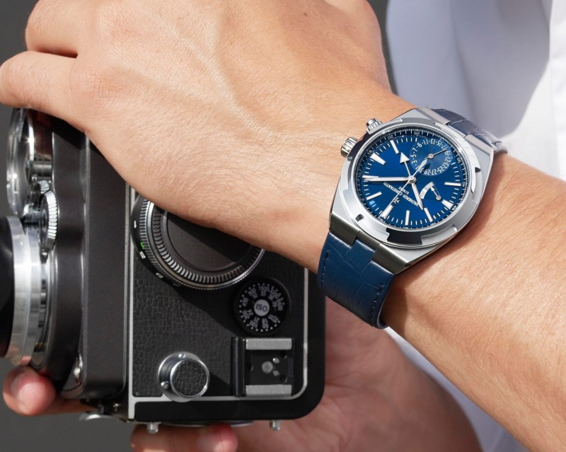 江詩丹頓(Vacheron Constantin)為Overseas兩地時間腕錶精鋼款分別搭配藍色或銀色漆面錶盤,烘托明晰的金質夜光指針和時標,小時指針指示佩戴者所處地點的本地時間,三角箭型指針指示參考時區時間。搭配精鋼錶鍊,並額外附上與錶盤顏色相襯的鱷魚皮及橡膠錶帶各一,休閒、正式,隨心變換。