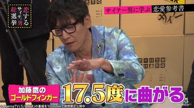 加藤鷹更在現場傳授「金手指」撇步,他透露想到達到神之手境界,手指一定要呈17.5度彎曲,隨後直接在現場示範,一邊彎曲手指,一邊強調「這個角度很重要,至於為何是17.5度,是因為剛好可以頂到G點」,讓現場所有人驚呼連連,有來賓詢問「要讓指原莉乃潮吹大概需要幾分鐘」,他面露自信說:「大概1分鐘以內。」
