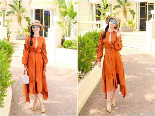照片中,范冰冰身穿橘色連身洋裝,轉身對著鏡頭回眸露出少女般的笑容,看起來相當青春洋溢。轉到正面,可以看到洋裝中間做了鏤空的設計,范冰冰的完美胸型若隱若現,性感又不失莊重,網友看了也紛紛大讚「美哭」、「超優雅」,相比先前的紅毯禮服,這套洋裝可說是讓她扳回一城。