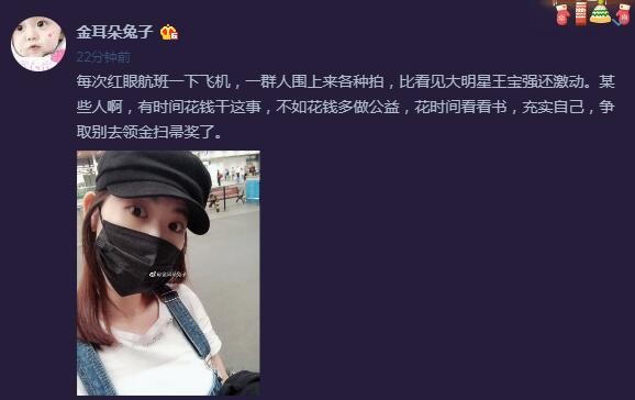 馬蓉微博被停權後,目前使用分身新帳號「金耳朵兔子」繼續抒發心情,昨晚深夜馬蓉曬出一張自拍照,寫下:「每次紅眼航班一下飛機,一群人圍上來各種拍,比看見大明星王寶強還激動。某些人啊,有時間花錢幹這事,不如花錢多做公益,花時間看看書,充實自己,爭取別去領金掃帚獎了。」