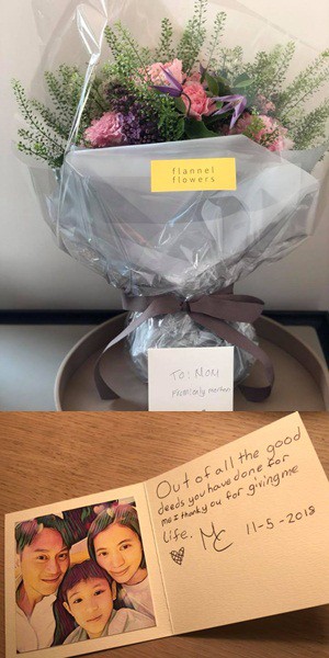 袁詠儀留言說:「Oh My God!OMG!OMG!連續10多句OMG!這是我家魔童先生,第一年送我的母親節花,卡片中說話真摯動人,Love You,祝各位母親節快樂。」為何袁詠儀如此感動?因為魔童在卡片中寫下:「Out of all the good deeds you have done for me, I thank you for giving me life.(在你為我做的所有好事中,感謝你賜予我生命)。」