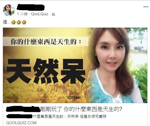 臉書近來舉辦「你的甚麼東西是天生的?」測驗,黃倩萍稍早在母親節日正當中,無聊玩了這項遊戲。測驗結果出爐,「天然呆」是她與生俱來個性,黃倩萍當場驚呼「準」到爆。