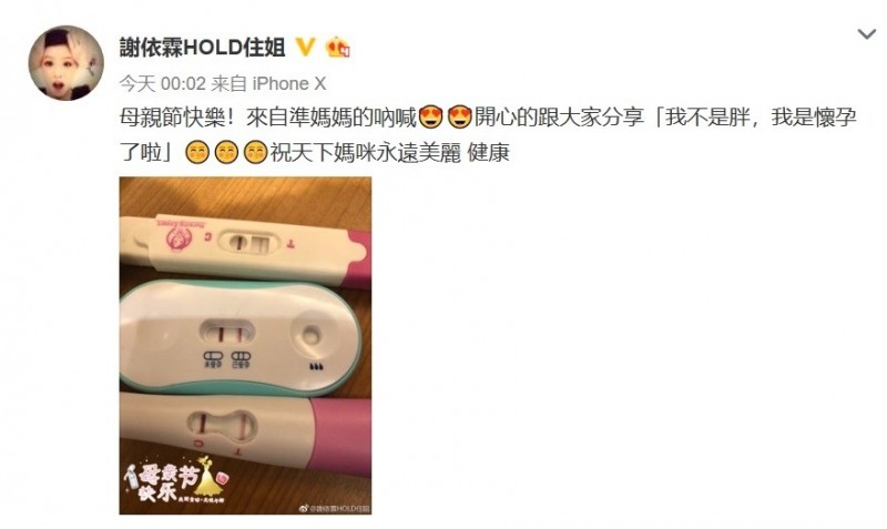 13日謝依霖在微博寫下:「母親節快樂!來自準媽媽的吶喊,開心的跟大家分享『我不是胖,我是懷孕了啦』,祝天下媽咪永遠美麗健康。」並放上三支驗孕棒的照片。不少粉絲看了,也紛紛獻上祝福,對於進度超神速,曾與謝依霖合作過《小時代》的郭采潔,也驚喜地在底下留言:「oh my god!」