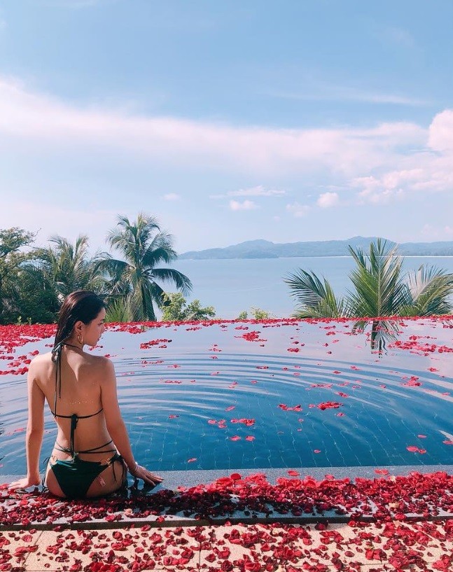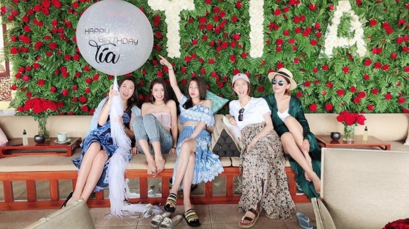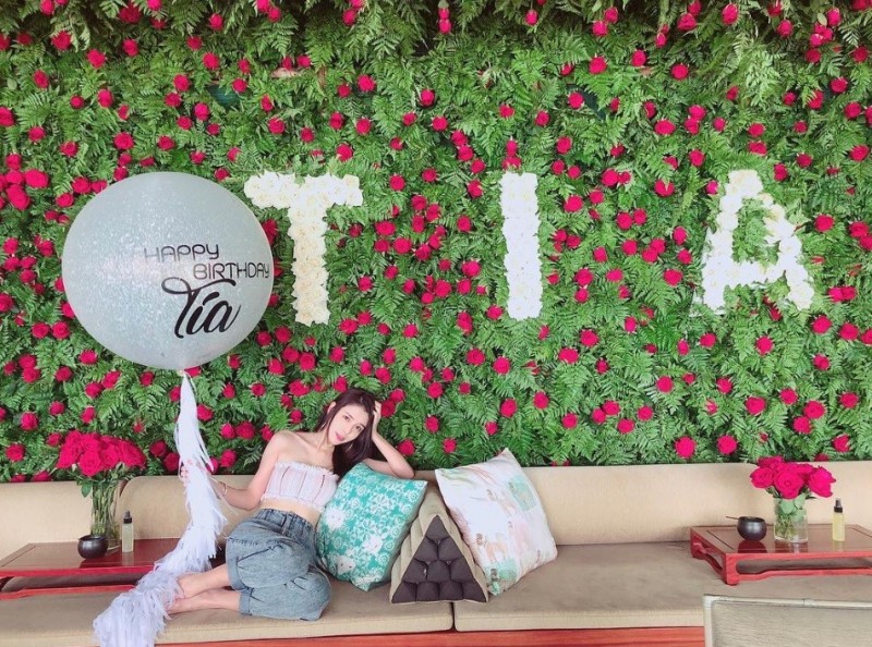 李毓芬11日過33歲生日,她和閨密王思平、宋米秦、陳筱蕾出國歡慶,眾人開心在無邊際泳池慶生,現場布置用心,牆上以紅花綠葉為底,中間用白玫瑰擺出其英文名「Tia」,泳池周圍還灑滿紅色花瓣,整體十分浪漫。
