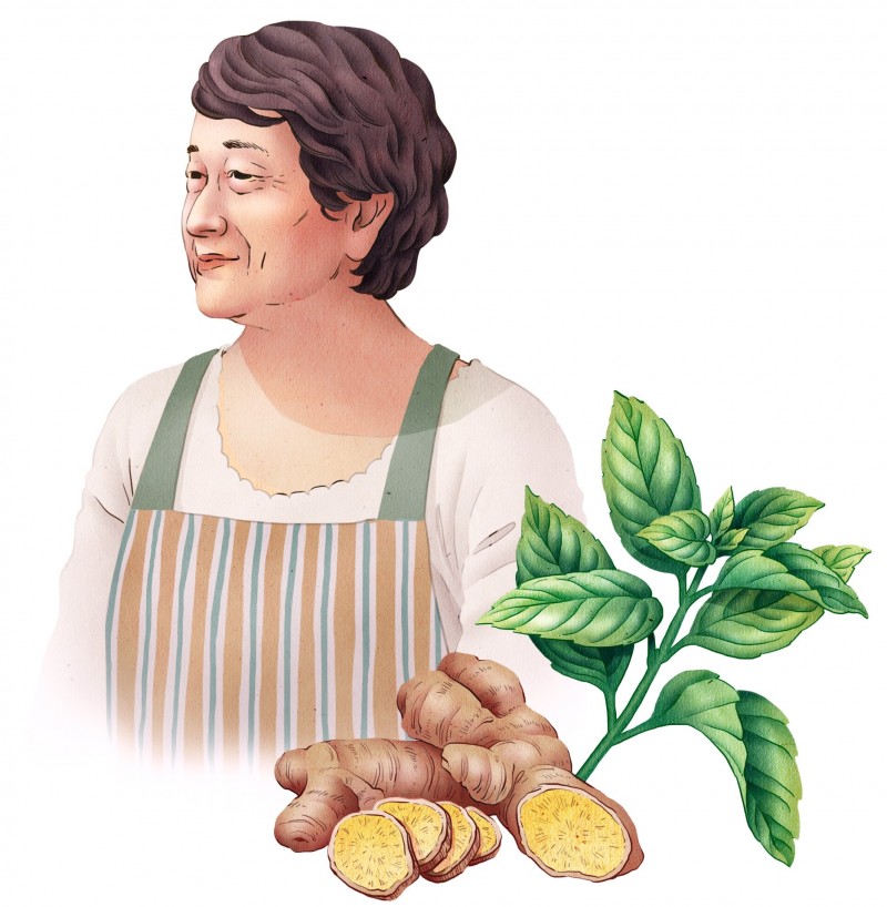 我生第一胎是回婆家坐月子的,婆婆天天煮麻油雞給我吃,連來看娃娃的客人,也都人手一碗。大家都說婆婆真會煮,完全是真材實料,用老薑煸香,加黑麻油、純米酒熬煮。為了給我補充青菜,還不時和她的姊妹――四阿姨和五阿姨討論,什麼菜比較「不冷」,可以給產婦吃。記得是紅鳳菜、莧菜、菠菜、A菜輪流吃,適合產婦滋補的九層塔炒蛋也隨時登場,而高麗菜是「冷」的,但婆婆會加上薑片去炒。這又讓我稱奇了,因為我娘家炒高麗菜,不是加蒜頭就是加蔥段去爆香。到了接近月子尾,阿姨們說想吃空心菜也可以,加老薑去炒就可以。
