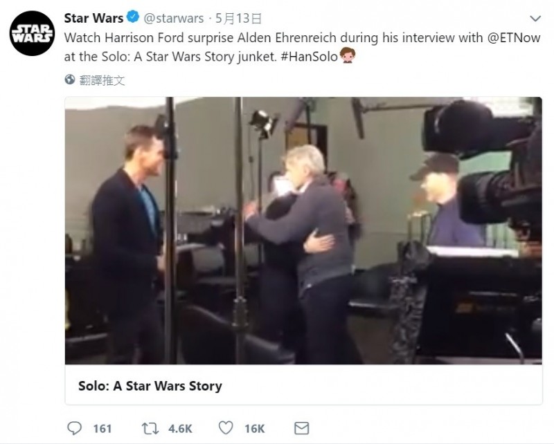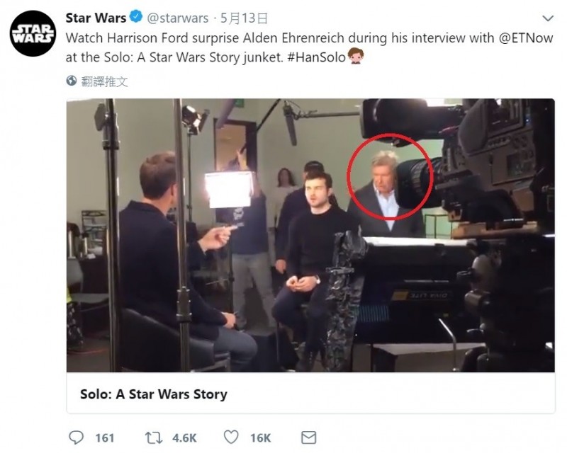 《星際大戰外傳:韓索羅》日前首映後也爆出絕佳好評,演出年輕版韓索羅的艾登艾倫瑞克也獲得不少讚聲,認為他在片中的表現讓人驚喜。艾登在記者會上表示說:「上午我接受電視台訪問時,哈里遜福特居然突然出現,真的讓我很感動!」他說2年前剛接到這個角色時也立刻詢問他的意見,「他還約我出來吃飯,給了我很多支持和鼓勵,如果沒有他的祝福,我絕對不敢接演這個角色」。