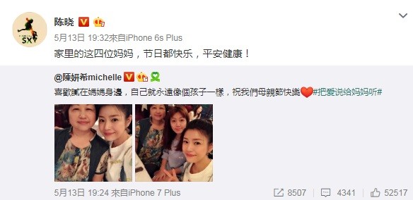 陳妍希表示「爸爸在拍戲,星星陪奶奶過母親節」,並嘴甜的祝婆婆母親節快樂,不久後陳妍希也秀出與自己媽媽和姐姐的合照,陳曉更是喊話「家裡的這四位媽媽,節日都快樂,平安健康」,展現出貼心的一面。